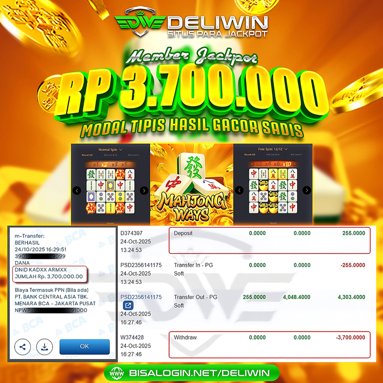 Continue readingMEMBER JACKPOT PROVIDER : PG SOFT PERMAINAN : MAHJONG WAYS DEPOSIT : IDR 255.000 WITHDRAW : IDR 3,700.000 DELIWIN Daftar