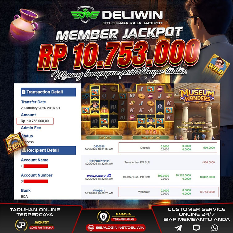 MEMBER JACKPOT PROVIDER : PG SOFT PERMAINAN : MUSEUM WONDERS DEPOSIT : IDR 500.000 WITHDRAW : IDR 10,753.000 Sebagai salah